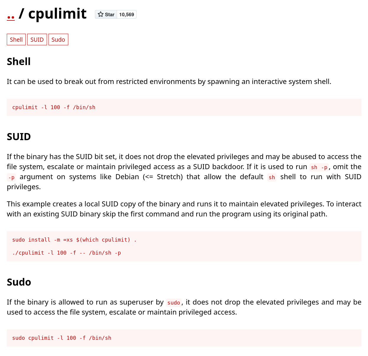 Nice, we can run cpulimit. Let’s see if we can exploit the sudo capabilities. I’m using gtfobins for this.